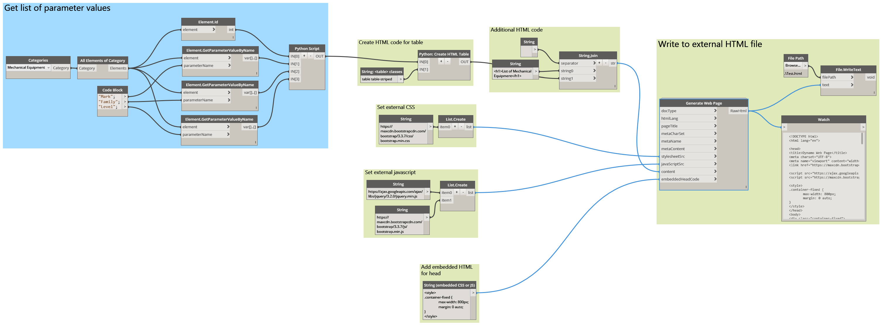 - Finally, the Generate Web Page node from the BIMxHTML package creates the entire web page’s code and then writes the code to an external HTML file.