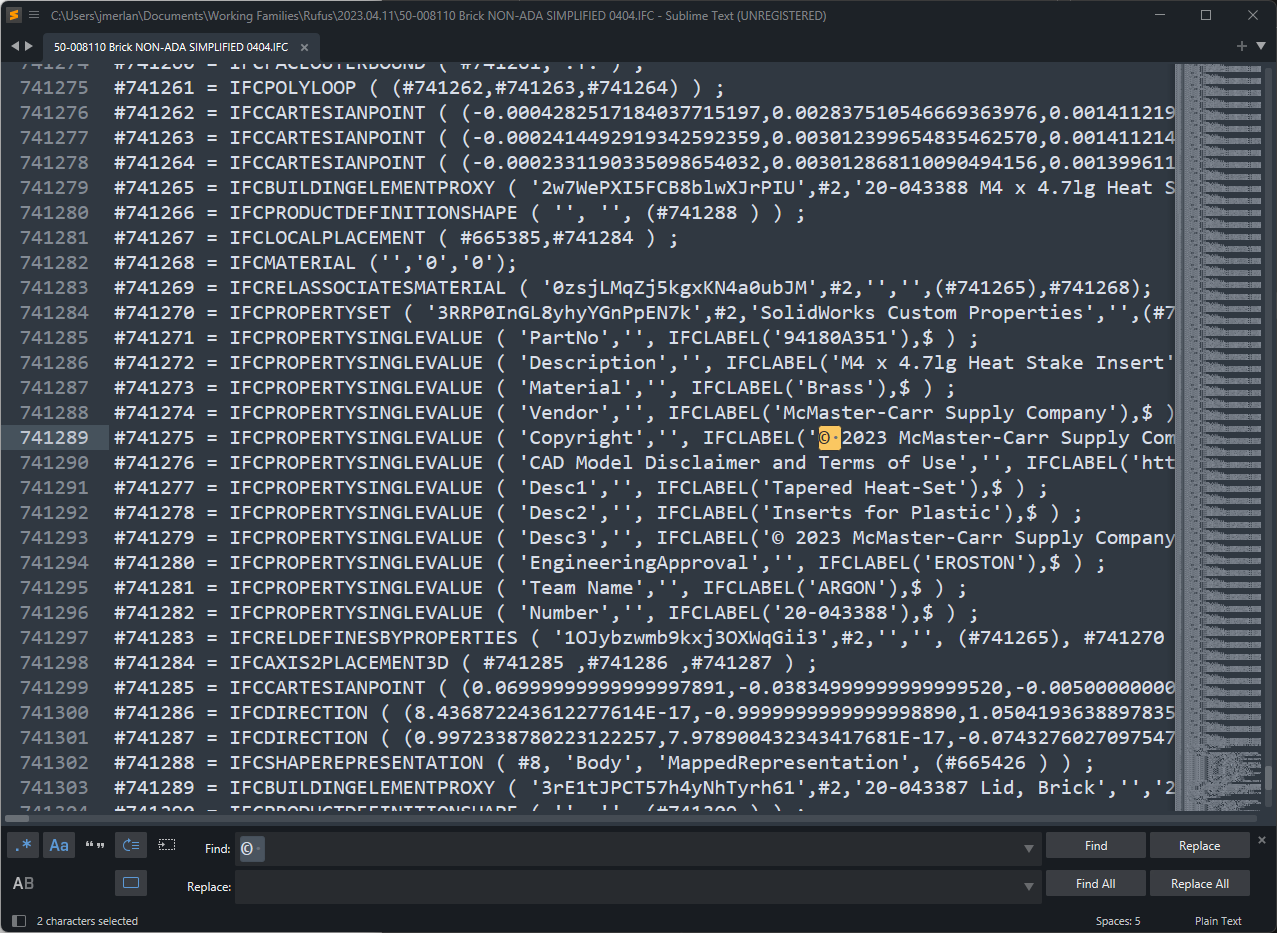 Editing IFC models can be difficult IF you need to edit the geometry, but in this case we only need to modify a few property values so I simply opened the IFC model in a plain text editor and used Find and Replace to remove all instances of the © character.