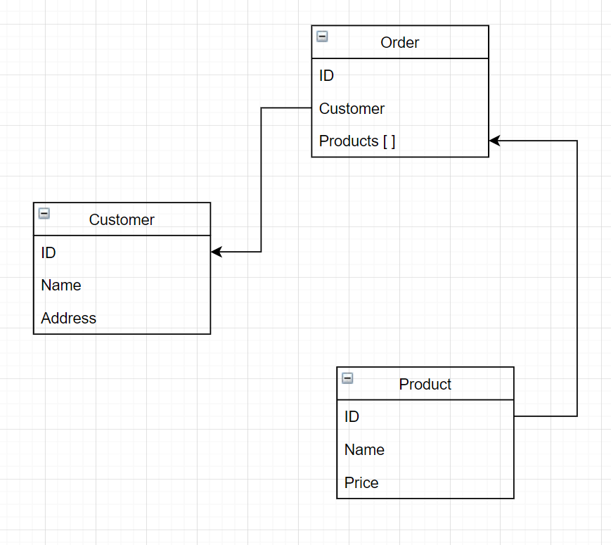 In the example below, we see what the data structure might look like for a customer who has made a purchase. Note that there are three tables 1) customer, 2) invoice, and 3) product.